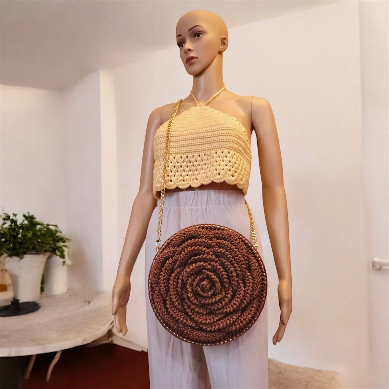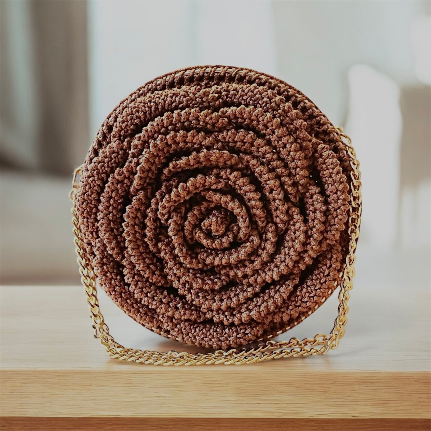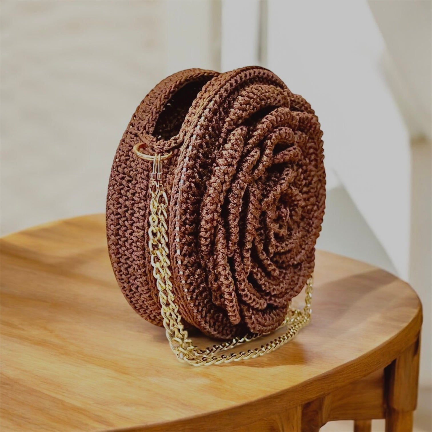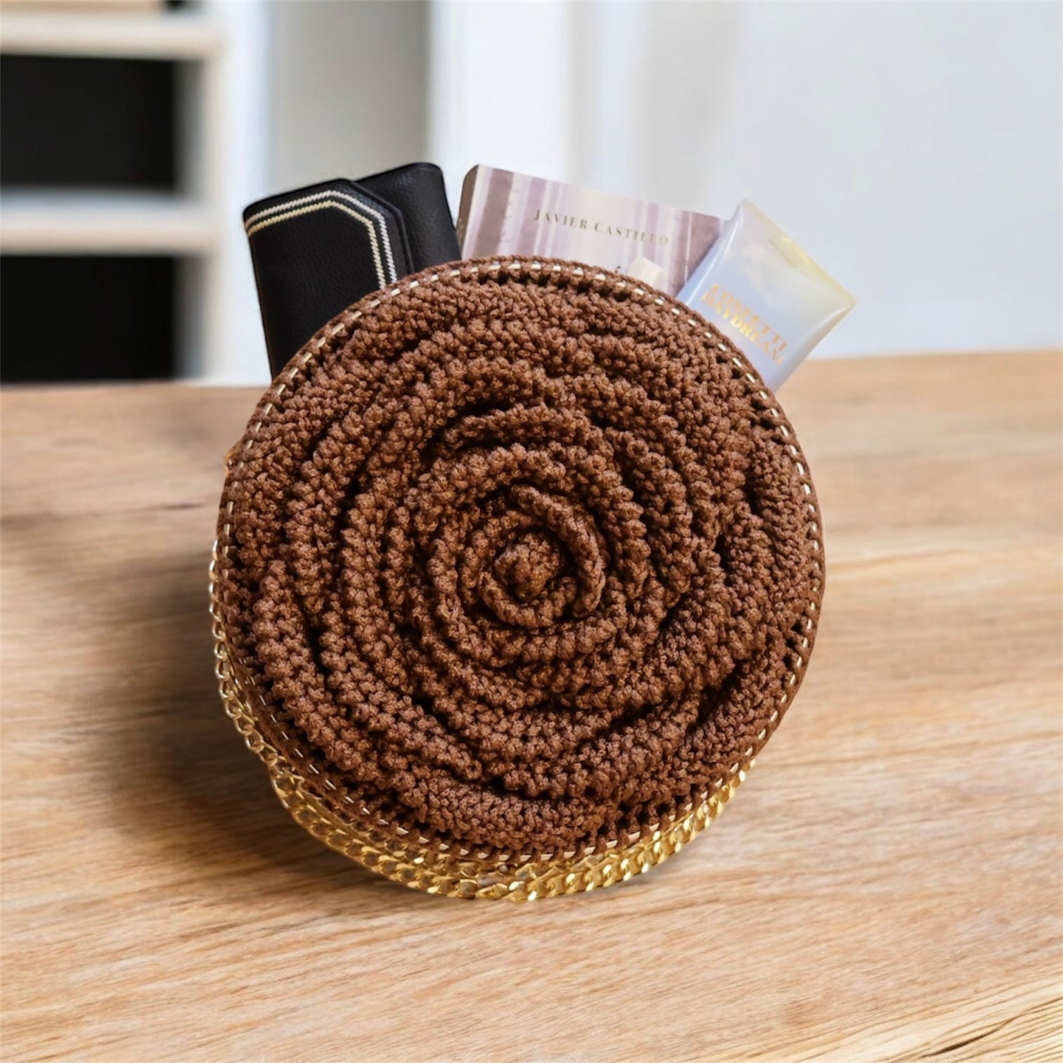 Cartera en forma de flor en una cara, es espaciosa y grande en tamaño, con detalles en dorado