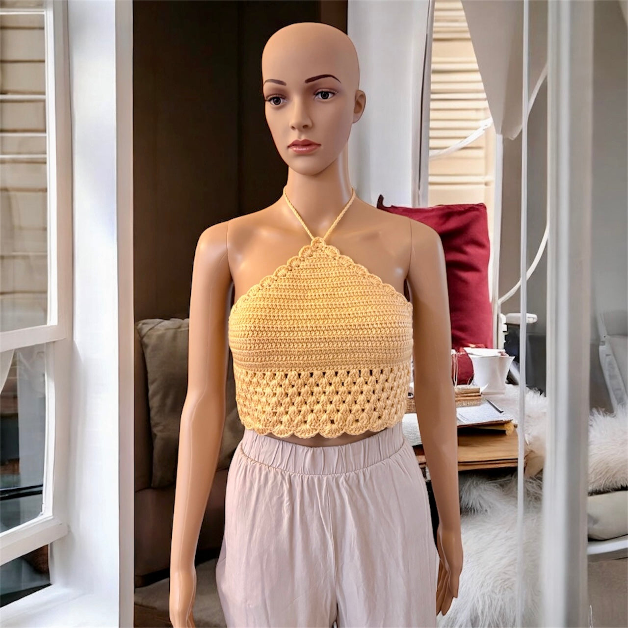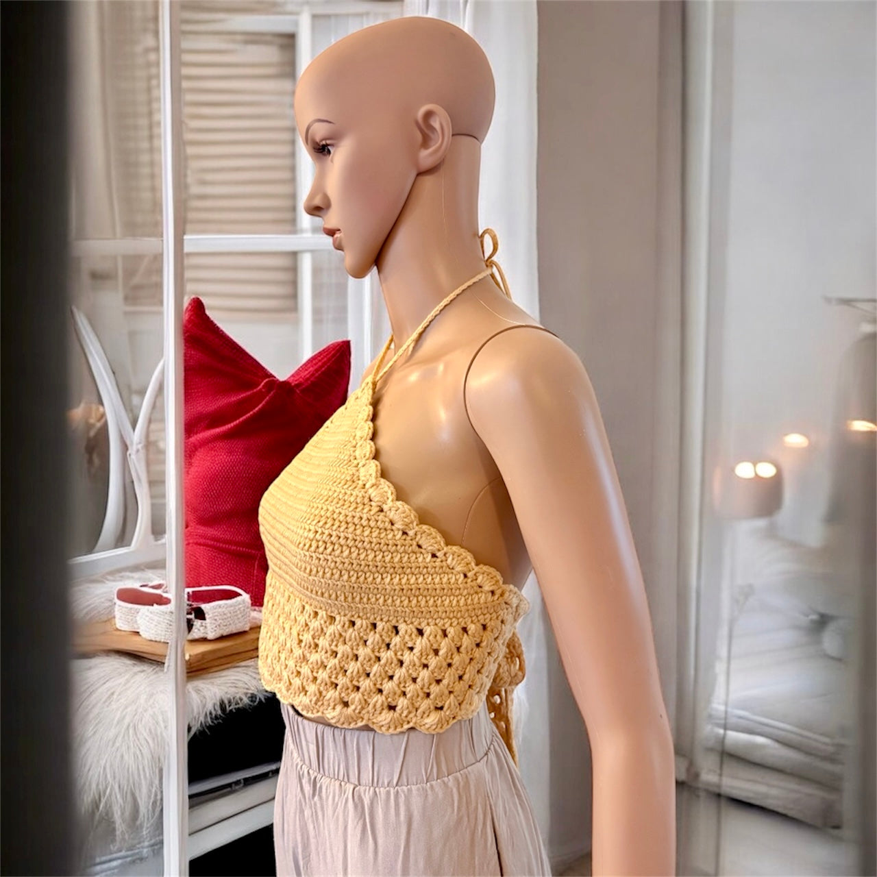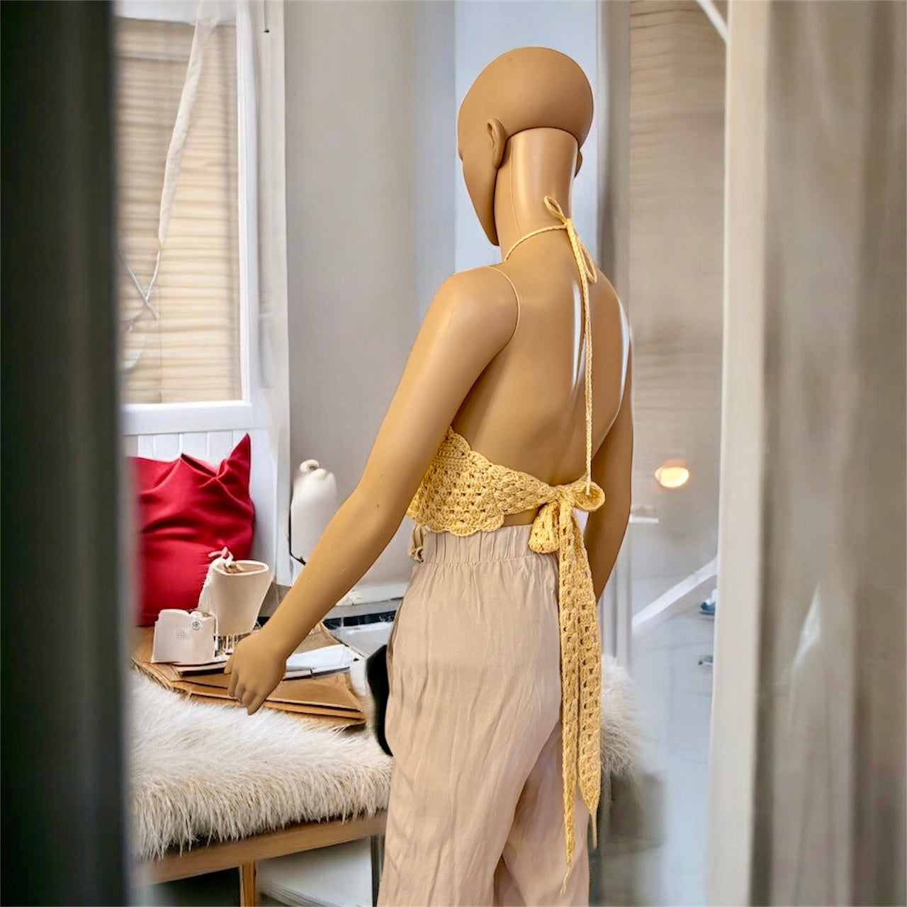 Top completamente ajustable en el cuello y la espalda. Hilo acrílico